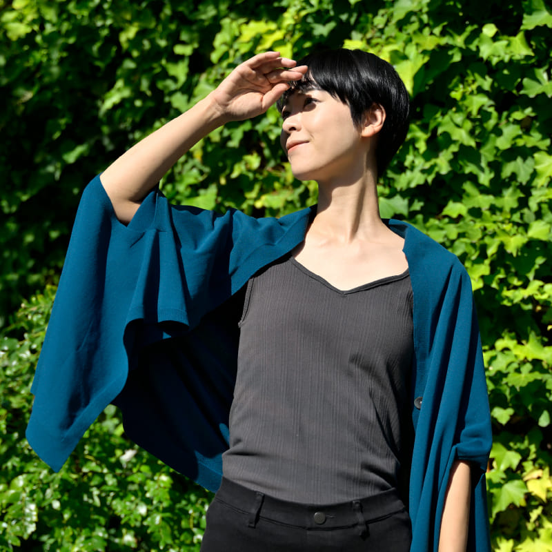 陽ざしが気になる季節には、羽織るだけで首から肩、腕や手の甲まで覆えるボレロが活躍します。