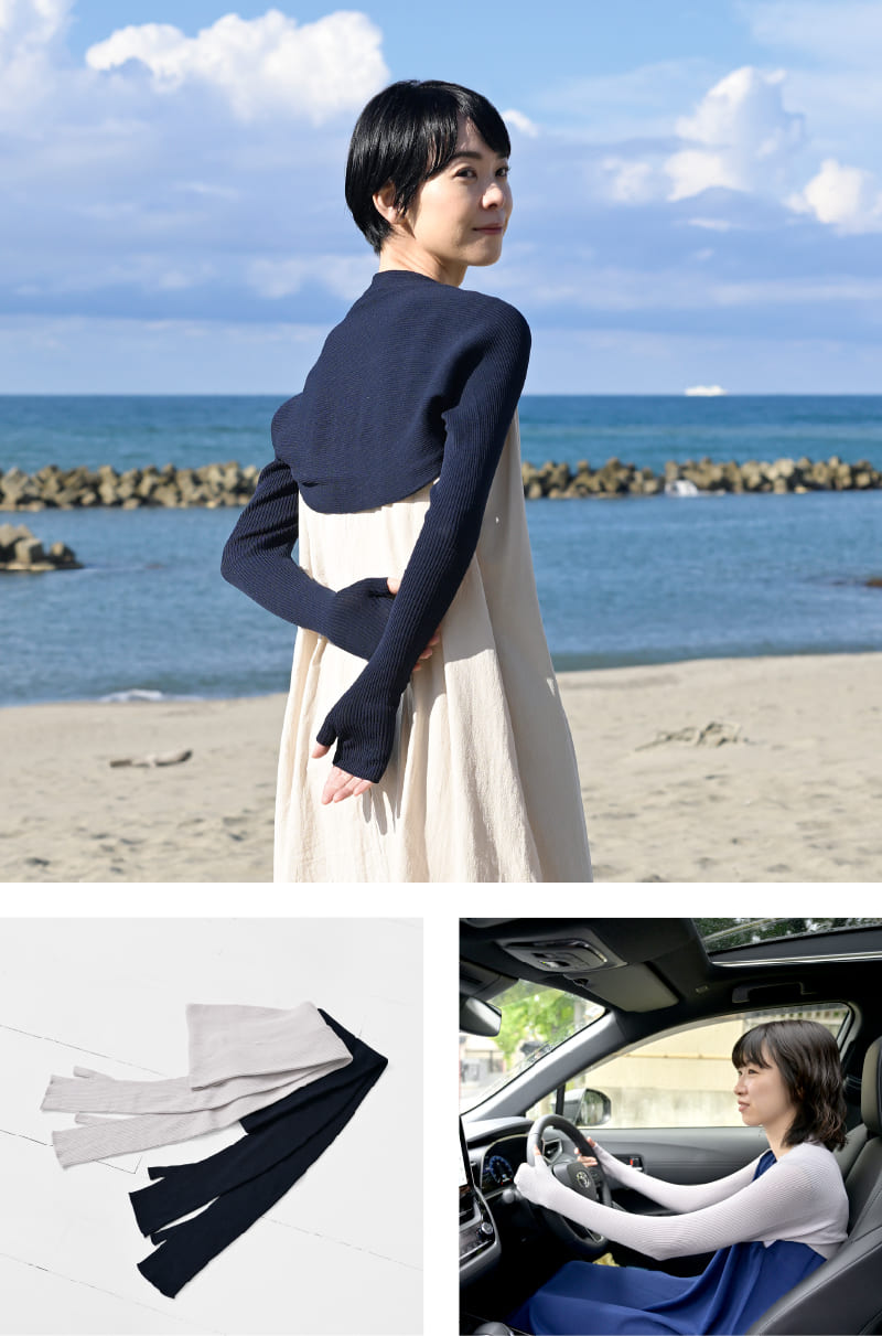 一緒に使うことで、首元から二の腕、手の甲までしっかりカバー。