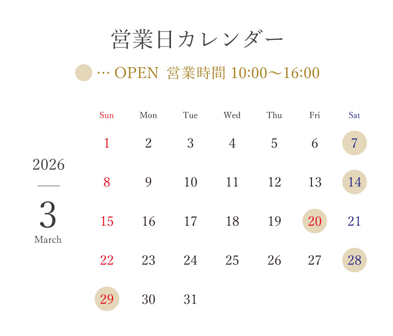 営業は主に土曜・日曜日ですが、営業日カレンダーをお確かめの上、ご来店をお願いします。