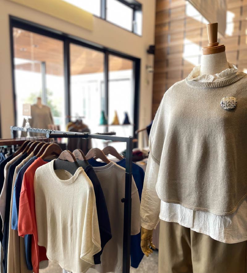 広々とした空間には、ニットポンチョ 「mino(みの)」 や、包み込む心地よさをテーマにした 「226(つつむ)」 のアイテムがずらり。