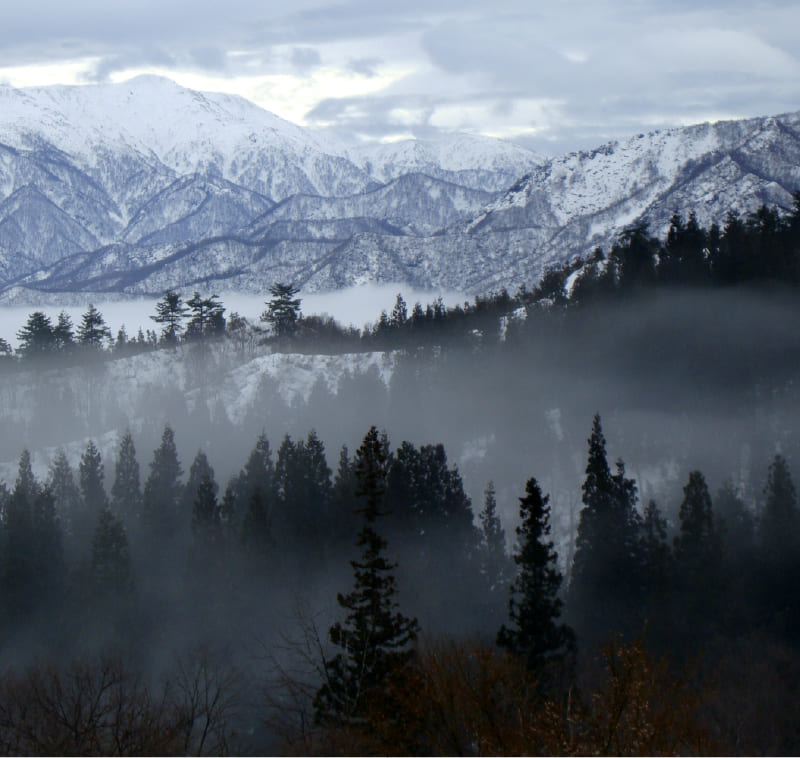 「もや」をとらえたこの写真は、魚沼にある宿「里山十帖」から巻機山(まきはたやま)を望んだもの。