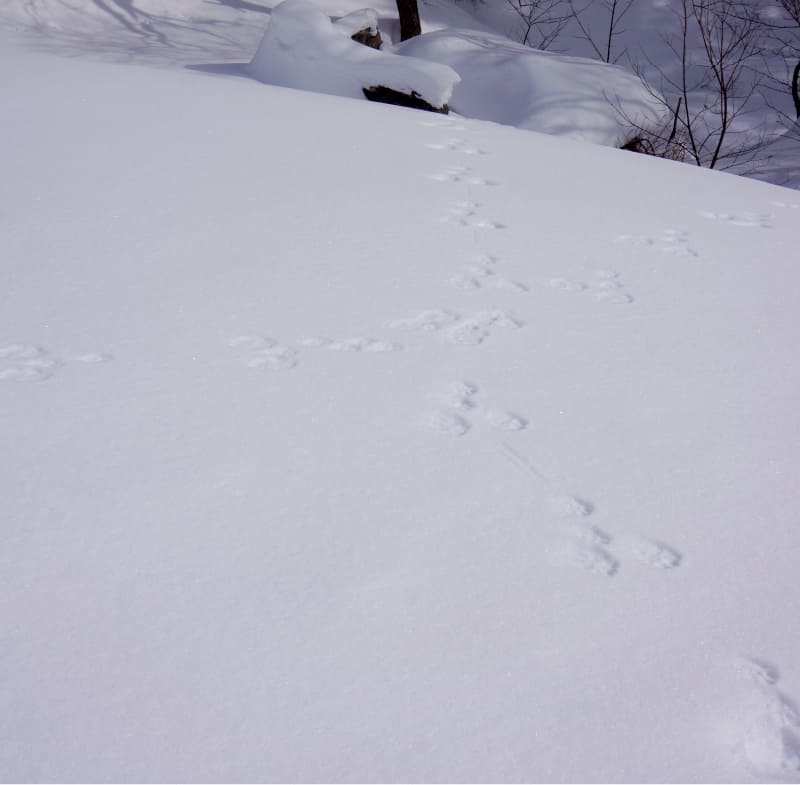奥深いブナの森でカモシカの姿を見つけたり、雪の上に描かれたウサギの足跡が交差点になっていたり。