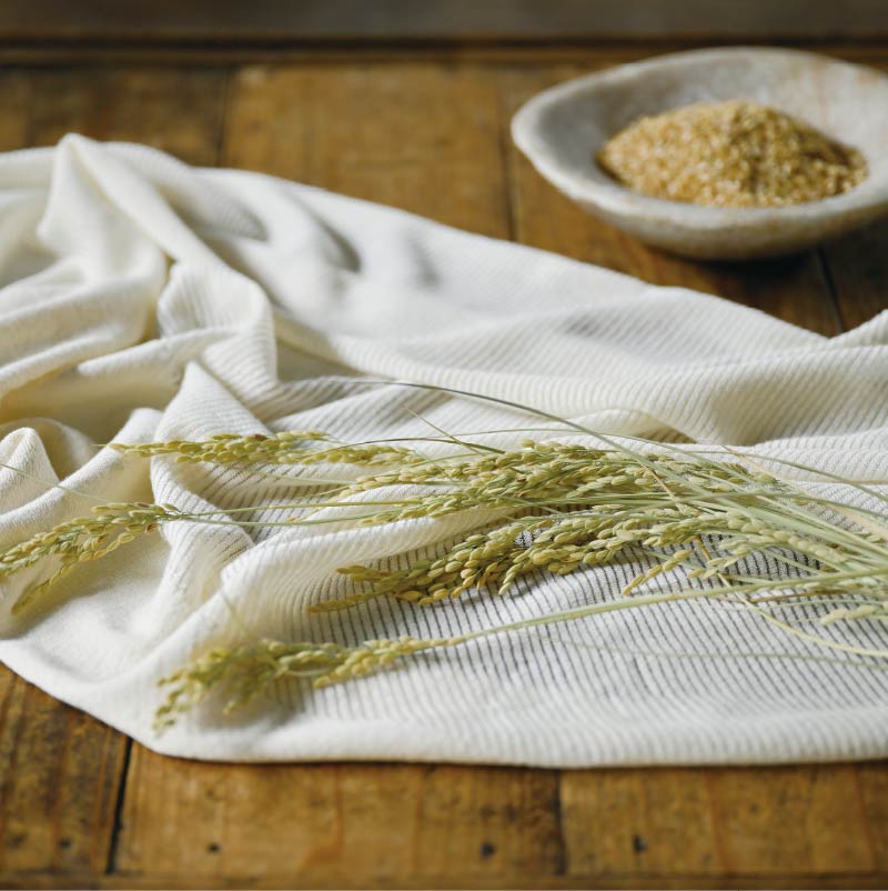 「nico ストールポンチョ / 光やわらぎ風通す 雪国新潟のもみ殻和紙」は、新潟産のお米のもみ殻を原料に和紙糸をつくり、すだれの横段模様を大胆に斜めに配置。「からだをつつむ / 光やわらぎ風通す 雪国新潟の透けるカーディガン」は、麻糸と半透明糸を交互に編むことで、透け感と着やすさが両立したデザインになりました。どちらも手洗いできて、夏の間くりかえし使えるように工夫しています。