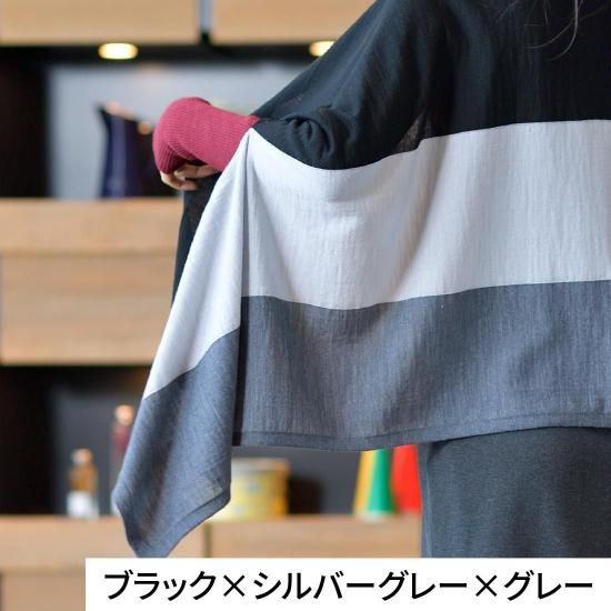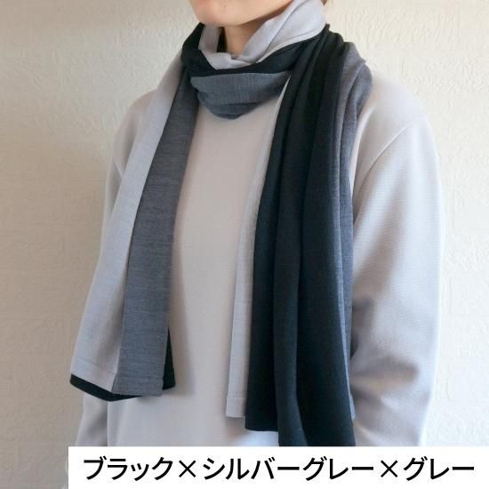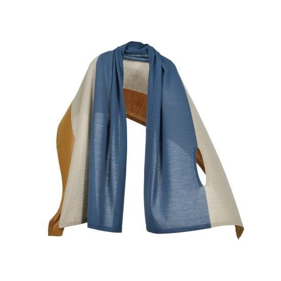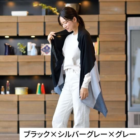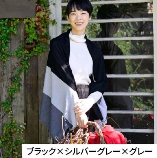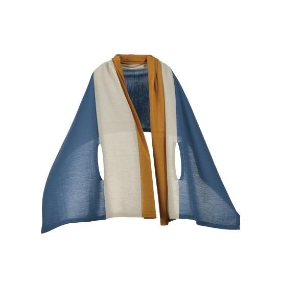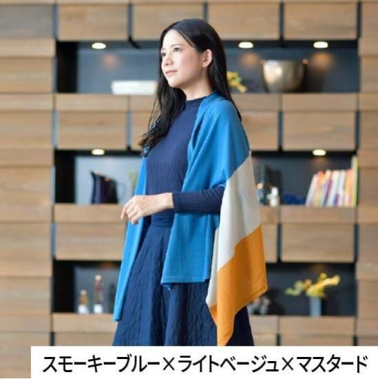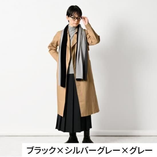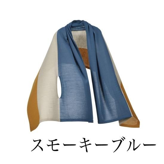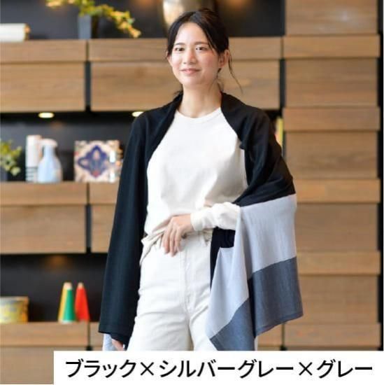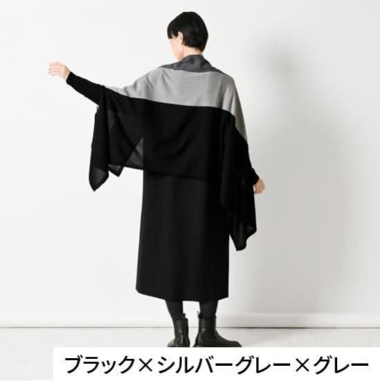 大胆で洗練された3色の切り替えが、このストールの最大の魅力です。肩からさらりと羽織るだけで、シンプルな装いにモードなニュアンスが加わります。