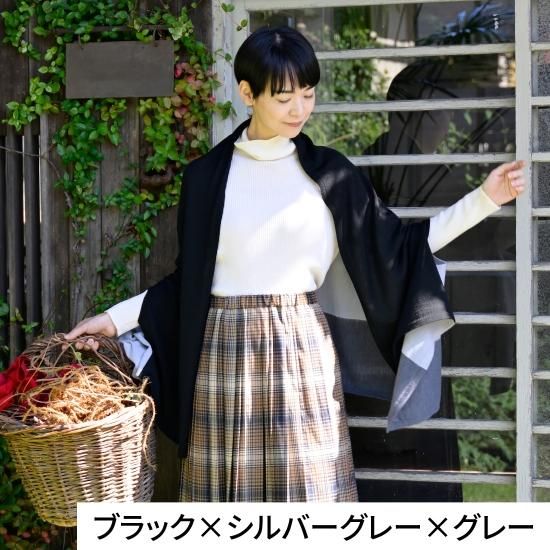 ブラックからグレーへと変わる同色系の1枚。シンプルなワンピースにさらりと羽織れば、モードな雰囲気の中に、やわらかな陰影が生まれます。