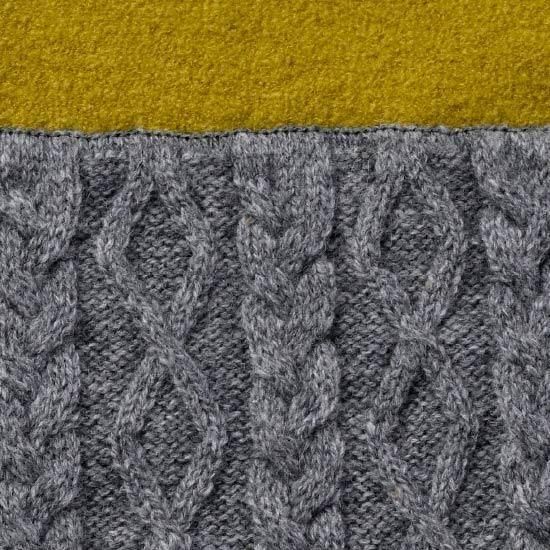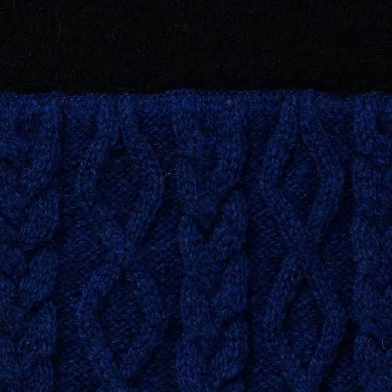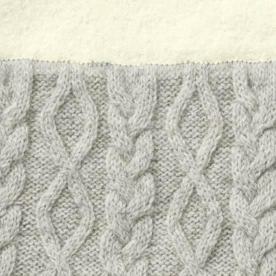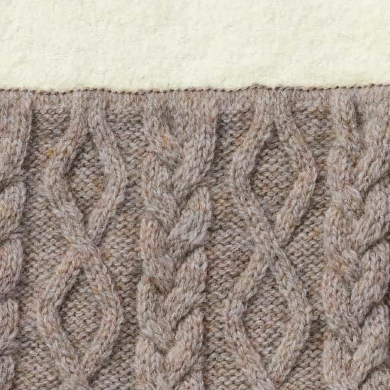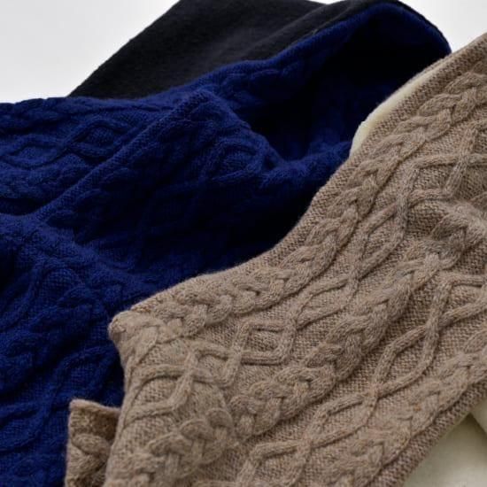 「表面のケーブル編み」も、「裏面のフラットな生地部分」もどちらもウール素材です。裏面は特になめらかで、肌辺りのいい風合いです。
