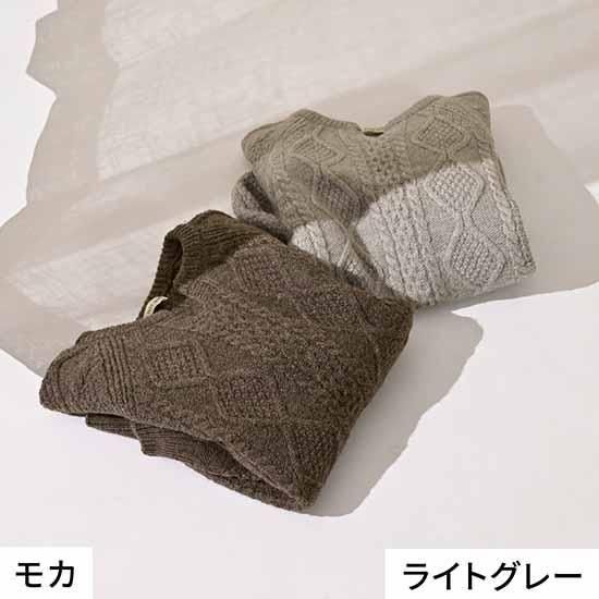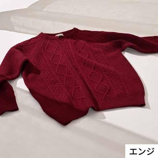 見た目は存在感のある編み柄ですが、重さはわずか390g。ローゲージニットにありがちな「重たくて肩がこる」心配もなく、快適に着ていただけます。