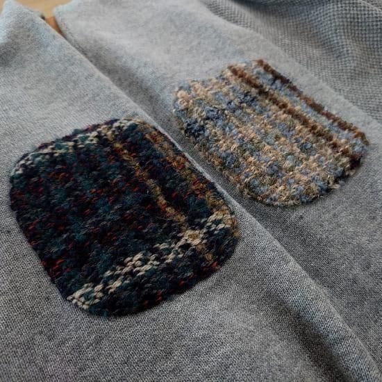身頃は杢調のグレーですが、エルボーパッチの色を2色ご用意しました。色がなじむ「グレーチェック」と、エルボーパッチが目立つ「ネイビーチェック」です。