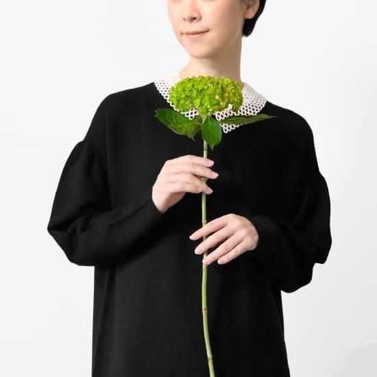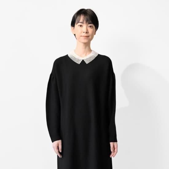 パールタイプのつけ衿風ネックレスが、とてもよく似合います。合わせる小物を変えることで、フォーマルにもカジュアルにも使える幅広さが魅力の1枚です。